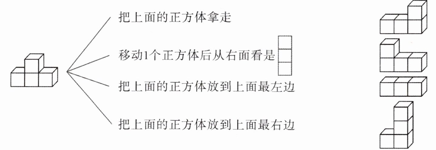 “把上面的正方体拿走”连第三幅图;“移动$1$个正方体后从右面看”连第四幅图;“把上面的正方体放到上面最左边”连第一幅图;“把上面的正方体放到上面最右边”连第二幅图。