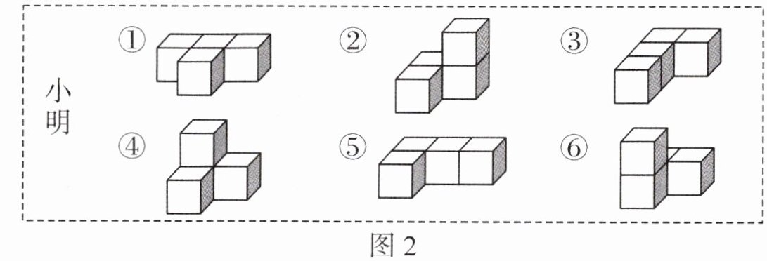 2. 如图所示,再添一个同样大小的小正方体,小明就把图1小丽搭的积木变成了图2六种不同的形状。