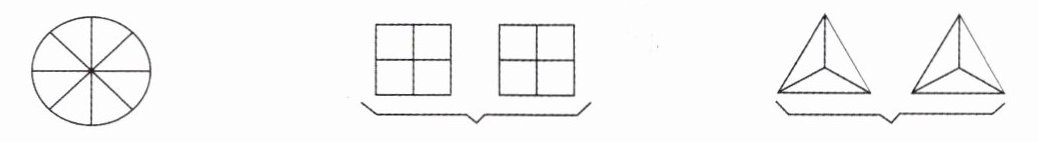 1. 把一个图形看作单位“1”,在图形中涂色表示下面的分数。