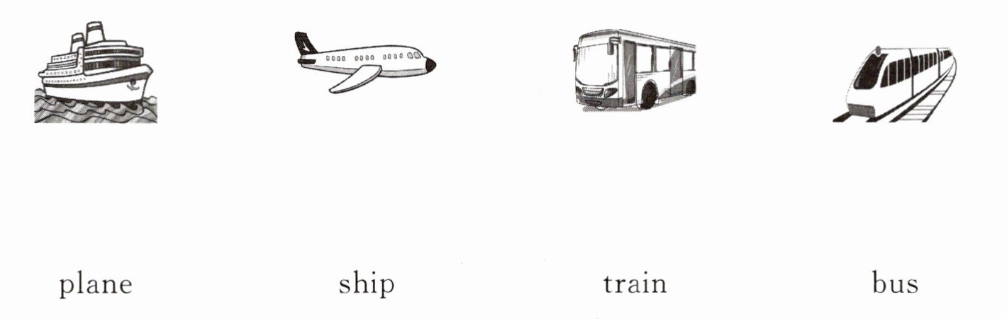 第一幅图(船)连 ship;第二幅图(飞机)连 plane;第三幅图(公交车)连 bus;第四幅图(火车)连 train。