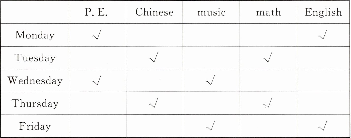 1. 表格中周一(Monday)的英语(English)课有√,说明周一有英语课,该说法正确。