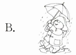 5. 句子“It is going to be rainy tomorrow.”提到了下雨,图片B中有雨伞和雨滴,可表示下雨,与之相符。