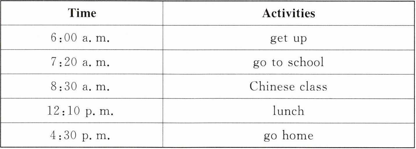 1. 对话中A问B“What time do you get up?”(你几点起床?),根据表格,起床时间是6:00 a.m.,所以回答“I get up at 6:00 a.m.”。