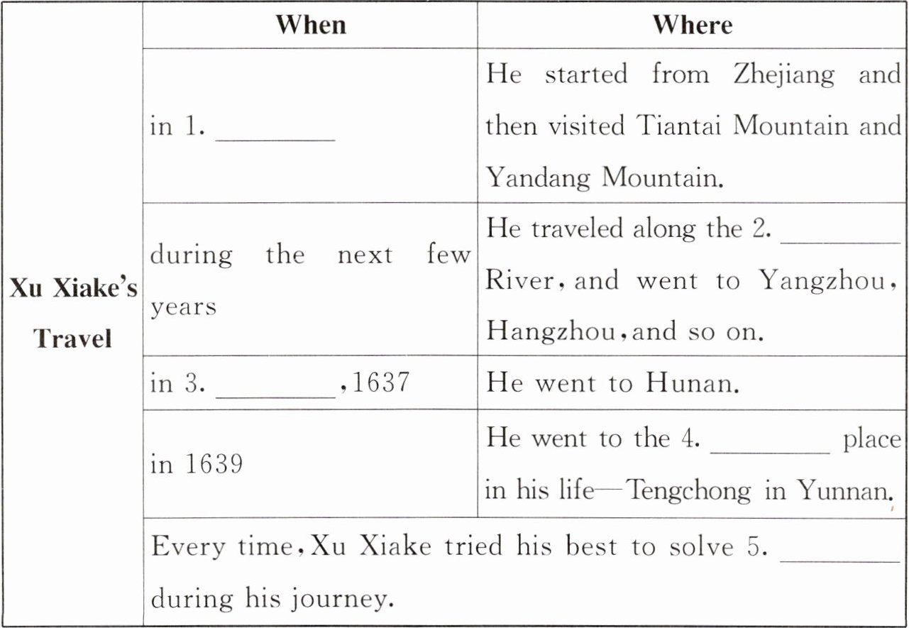 In January,1637,he went to Hunan. He traveled south along the Xiangjiang River,and visited many places in the south of China like Guilin. In 1639,he got to the westernmost(最西边的)place in his life—Tengchong in Yunnan.