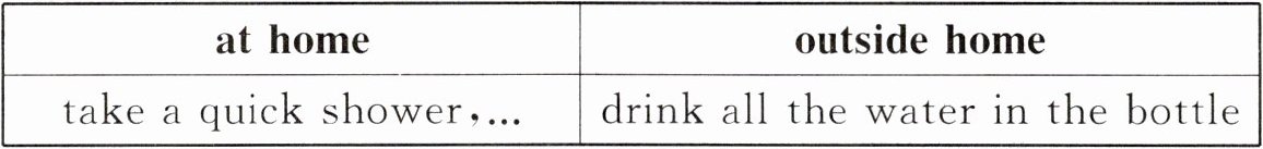 Firstly, at home, we can take a quick shower instead of a long bath. Secondly, we can use the water we wash vegetables to water flowers. Besides, when we are outside home, we should drink all the water in the bottle. Don't throw away the bottle with some water left. What's more, we can also reuse water in many other ways.