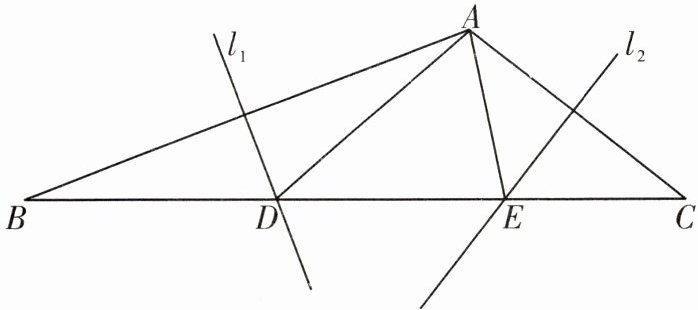2. 如图,在$\triangle ABC$中,边$AB的垂直平分线l_{1}与边BC相交于点D$,边$AC的垂直平分线l_{2}与边BC相交于点E$($D在E$的左侧).若$\triangle ADE的周长为8$,$∠DAE= 60^{\circ }$.