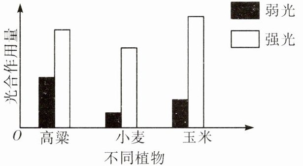 B选项:图中是强光和弱光下的比较,并没有同等光照强度下玉米和高粱光合作用量的比较,B错误。
