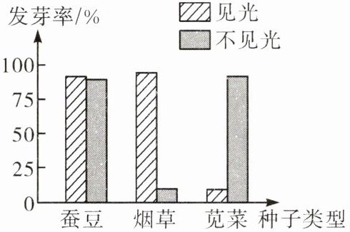 1. 研究人员在见光和不见光条件下分别测试了蚕豆、烟草和苋菜的种子发芽率,结果如图所示。下列判断错误的是()