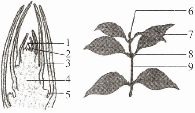 1. 如图是枝芽及其发育成的枝条结构示意图,图中1~9代表相应结构。下列说法错误的是()