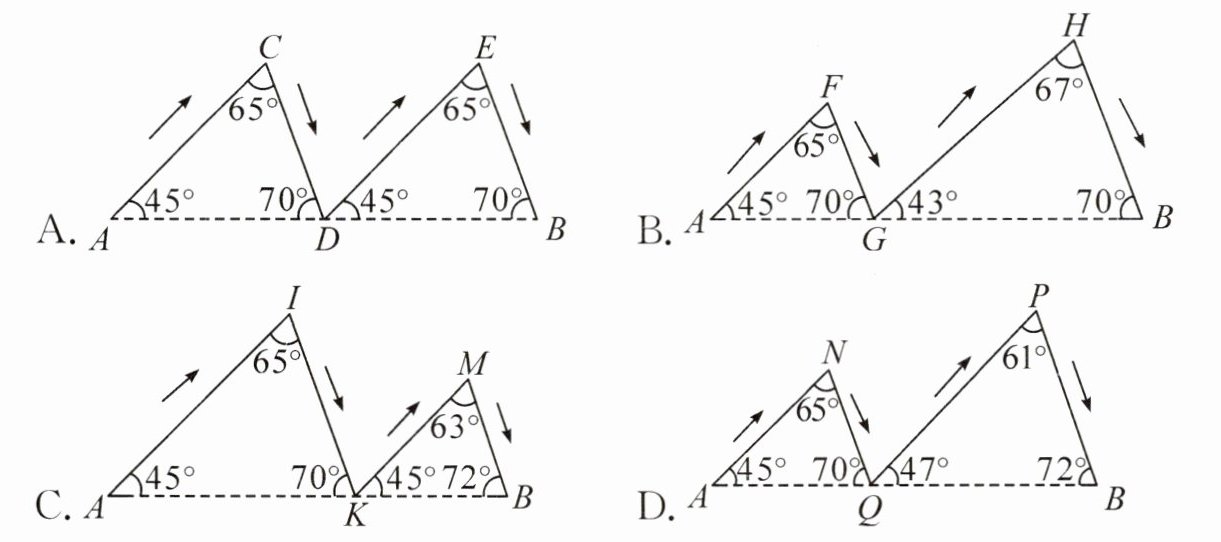 进一步分析,设$\angle FGA = 180^{\circ}-45^{\circ}-65^{\circ}=70^{\circ}$,$\angle HGB = 180^{\circ}-70^{\circ}-67^{\circ}=43^{\circ}$,通过角度关系和三角形边长关系可知其路线长度大于其他选项。