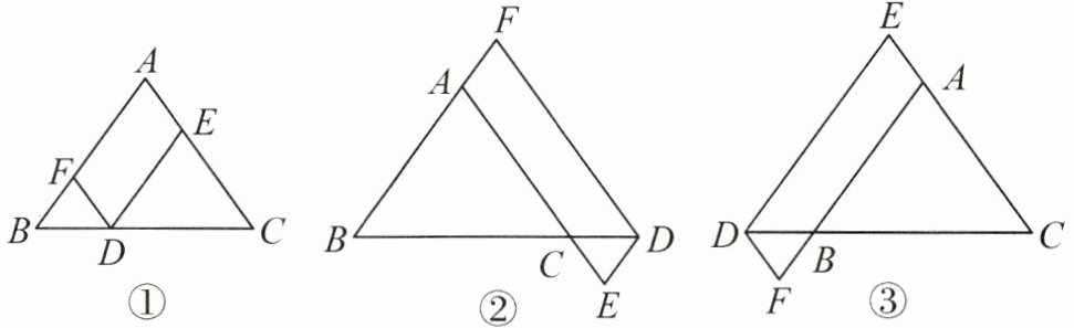 1. 在$\triangle ABC$中,AB= AC,点 D 在边 BC 所在的直线上,过点 D 作 DF$// AC$交直线 AB 于点 F,DE$// AB$交直线 AC 于点 E.