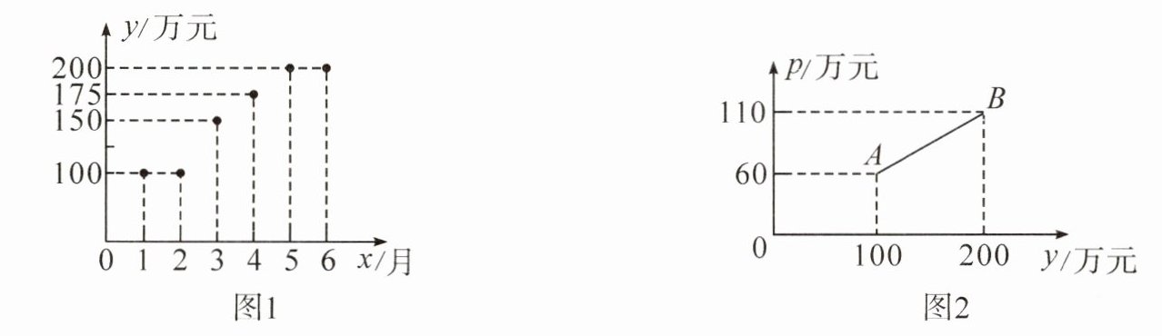2. 某公司今年如果用原线下销售方式销售一种产品,每月的销售额可达100万元.由于该产品供不应求,该公司计划于3月份开始全部改为线上销售,这样,预计今年每月的销售额y(万元)与月份x(月)之间函数关系的图象如图1中的点状图所示(5月及以后每月的销售额都相同),而经销成本p(万元)与销售额y(万元)之间函数关系的图象如图2中线段AB所示.