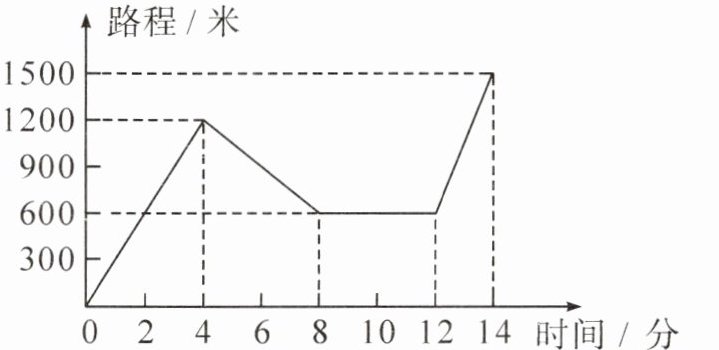 - $0 - 4$分钟:速度$v_1=\frac{1200}{4}=300$(米/分)。