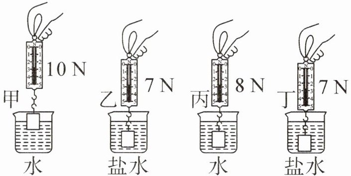 乙和丁,液体密度不同(盐水和盐水,但物体排开液体体积是否是唯一变量不明确,且主要是液体密度不同的对比),不符合。