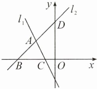 如图, 直线 $ l_1, l_2 $ 交于点 $ A $, 直线 $ l_2 $ 与 $ x $ 轴、$ y $ 轴分别交于点 $ B(-4, 0), D(0, 4) $, 直线 $ l_1 $ 所对应的函数表达式为 $ y = - 2x - 2 $, 且与 $ x $ 轴交于点 $ C $.