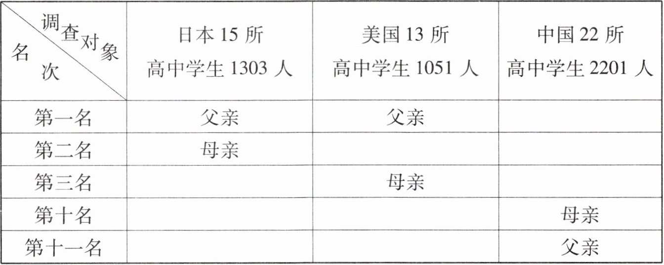 一家青少年研究所进行一项调查活动,分别对日本、美国和中国内地的高中生进行“受你尊敬的人物”的问卷调查,下面是调查结果的统计表。