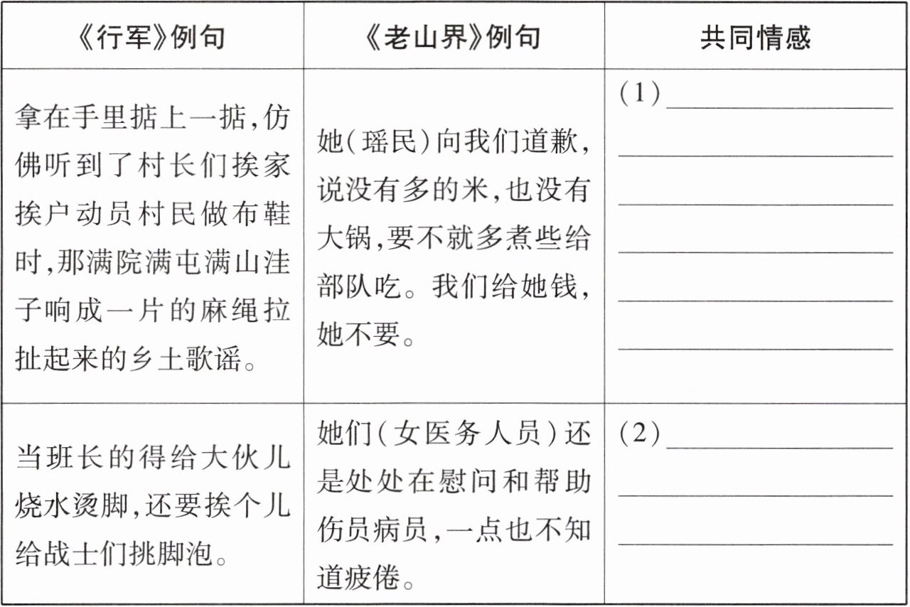 5. 【链接教材】程多宝的《行军》和陆定一的《老山界》写的都是我军战士的故事,两文在情感表达上有相似之处,请对照下面表格中的内容,概括两文中的例句包含的共同情感。