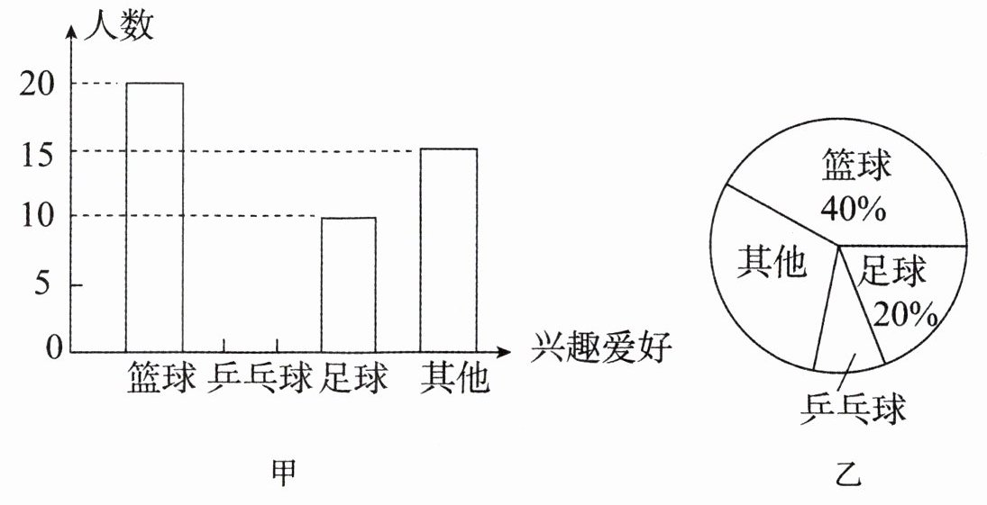 (2)请在图甲中将“乒乓球”部分的图形补充完整,并求出扇形统计图中表示“足球”的扇形圆心角的度数。