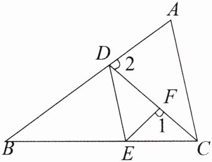 7. 如图,已知$∠1+∠2= 180^{\circ}$,$∠DEF= ∠A$,试判断$∠ACB与∠DEB$的大小关系,并对结论进行说明.