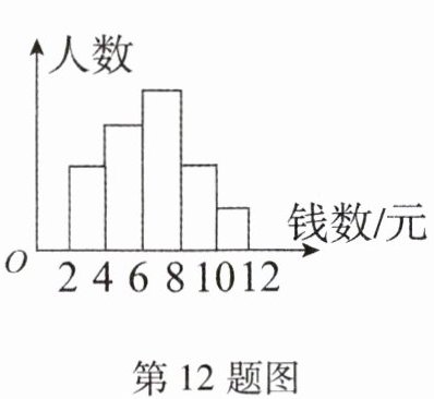 12. 某校七年级(1)班为了了解同学们一天零花钱的消费情况,对本班同学开展了调查,将同学们一周的零花钱以2元为组距,绘制如图所示的频数分布直方图,已知从左到右各组的频数之比为2:3:4:2:1.