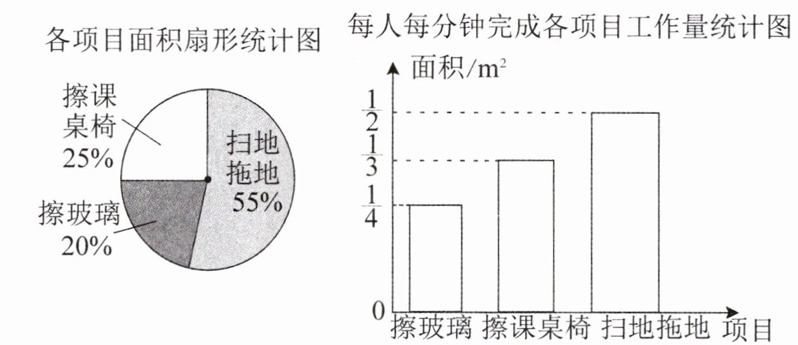 14. 某班13名同学参加每周一次的卫生大扫除,按学校的卫生要求需要完成总面积为$80m^2$的三个项目的任务,三个项目的面积比例和每人每分钟完成各项目的工作量如图所示.