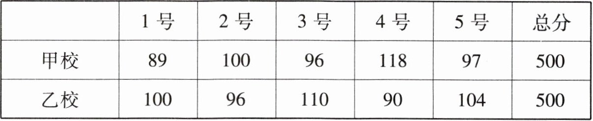 甲校的方差 $s^{2}_{甲} = [(89 - 100)^{2} + (100 - 100)^{2} + (96 - 100)^{2} + (118 - 100)^{2} + (97 - 100)^{2}]÷5 = 94$;