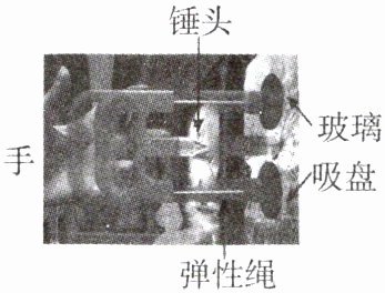 3. 紧急情况逃生时,使用普通破窗锤产生的碎玻璃容易伤人,如图为一种新型破窗锤,使用时将吸盘吸附在玻璃上,拉长弹性绳,人离玻璃较远后松手,破窗锤在弹力作用下瞬间击碎玻璃而不会伤到 人,下列有关说法正确的是 (