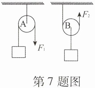 杠杆。若不计滑轮 B 的重力及绳重与摩擦,物体所受的重力为 50 N 且处于静止状态,则力 $ F_{1} $ 的大小为50