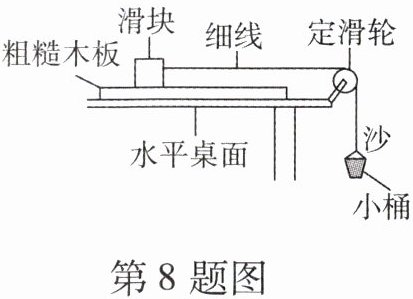 8. 如图所示的实验装置中,小桶内装入适量的沙子,小桶和沙子的总质量为 m 时,滑块在木板上恰好做匀速直线运动(细线重力、滑轮摩擦不计),滑块受到的滑动摩擦力 $ f = $____