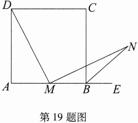 19. 如图,在正方形ABCD中,M为AB的中点,$MN⊥MD,BN平分∠CBE$,并交MN于N.求证:$MD= MN$.