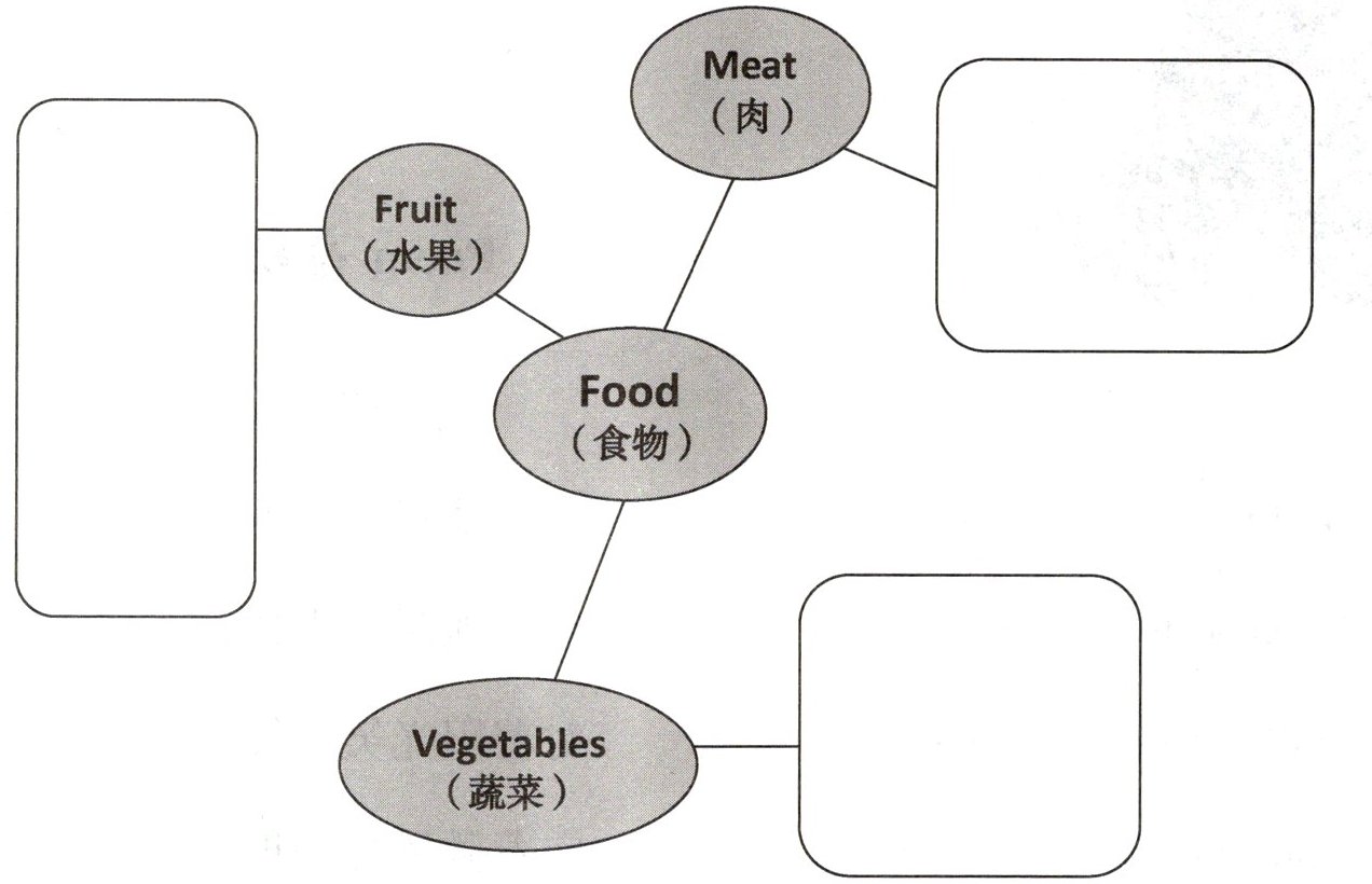 一、同学们,让我们来玩一玩“英语单词联想记忆”的游戏吧!请在下面的方框中按类别写出你知道的与“Food(食物)”相关的英语单词。