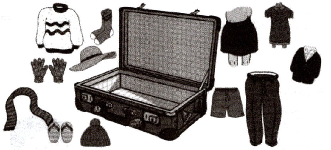 二、莉莉准备暑假和家人一起去三亚旅游。请观察行李箱旁的衣物,仔细想想莉莉是否需要带这些衣物。