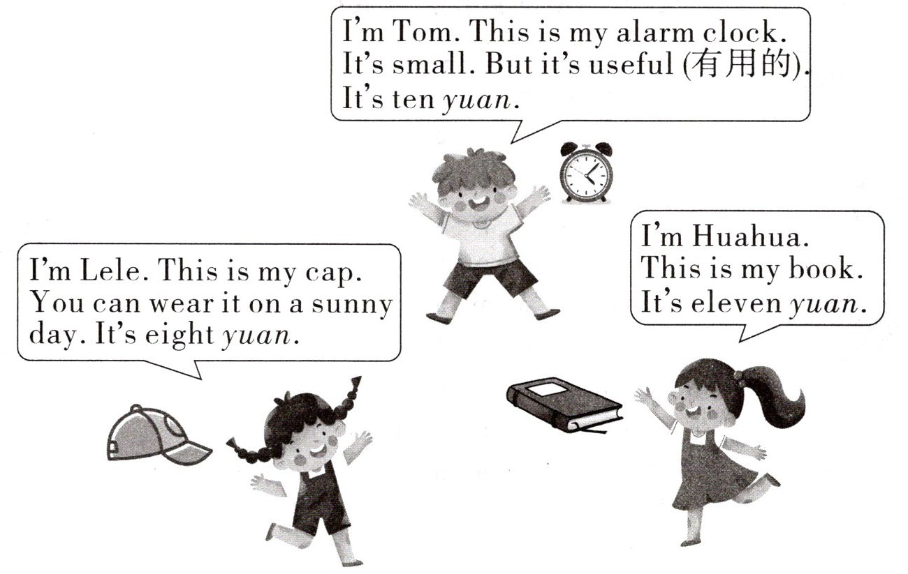 Hi, I'm [你的名字]. Look at my [物品名称]. It's [物品特点]. And it's [价格] yuan. (答案不唯一,根据实际情况填写)