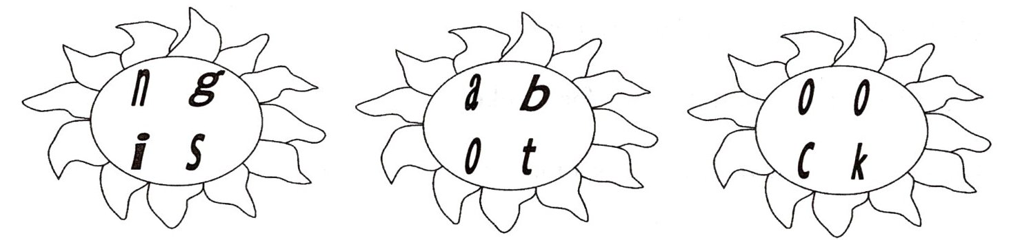 一、每朵葵花上都有一组打乱顺序的字母,请你用这组字母拼写出一个单词,写在每朵葵花下面的横线上。