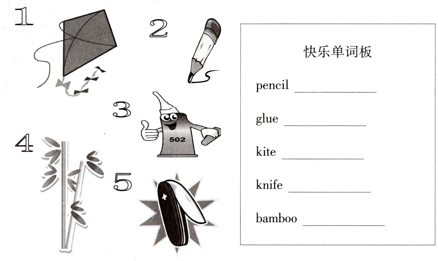 一、请读一读“快乐单词板”中的英语单词,你能找到每个单词相对应的图片,并将序号填写在单词后的横线上吗?