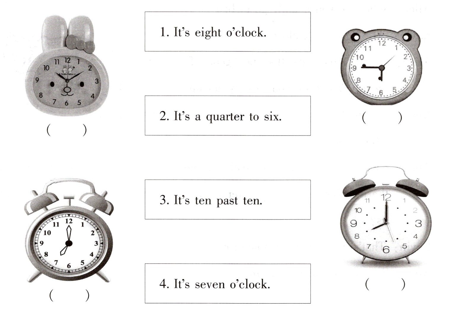 一、同学们,这里有很多漂亮的小闹钟,你能用英语说一说闹钟上的时间吗?请找到这些闹钟上的时间所对应的英语句子,并将序号填入相应闹钟图片下的括号里。