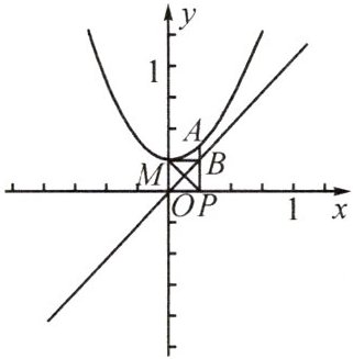 ∴当$n=\frac{1}{4}$时,d取得最小值$\frac{1}{8}.$此时$,B(\frac{1}{4},\frac{1}{4}),$而$M(0,\frac{1}{4})、$$P(\frac{1}{4},0)$
