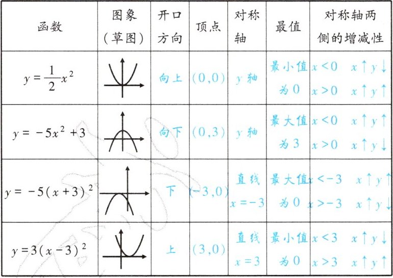 向上; $(0,0)$; $y$轴; 最小值为0; $x<0$ $x↑y↓$ $x>0$ $x↑y↑$; 向下; $(0,3)$; $y$轴; 最大值为3; $x<0$ $x↑y↑$ $x>0$ $x↑y↓$; 下; $(-3,0)$; 直线$x=-3$; 最大值为0; $x<-3$ $x↑y↑$ $x>-3$ $x↑y↓$; 上; $(3,0)$; 直线$x=3$; 最小值为0; $x<3$ $x↑y↓$ $x>3$ $x↑y↑$