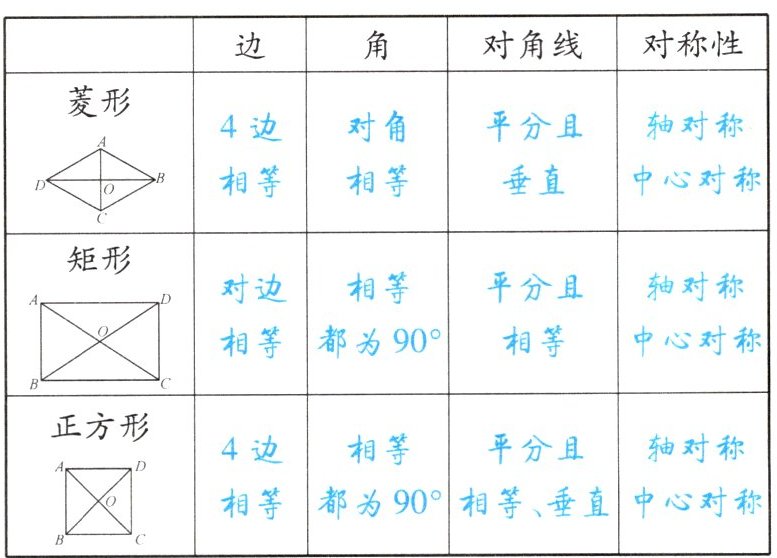 | 矩形 | 对边相等 | 相等都为$90^{\circ}$ | 平分且相等 | 轴对称中心对称 |