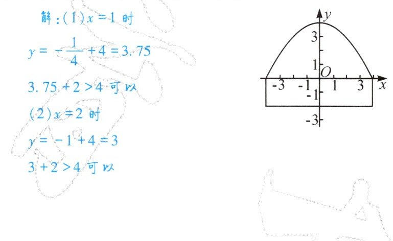解:(1)x=1时$y=-\dfrac{1}{4}+4=3.753.75+2>4$可以(2)x=2时y=-1+4=33+2>4可以
