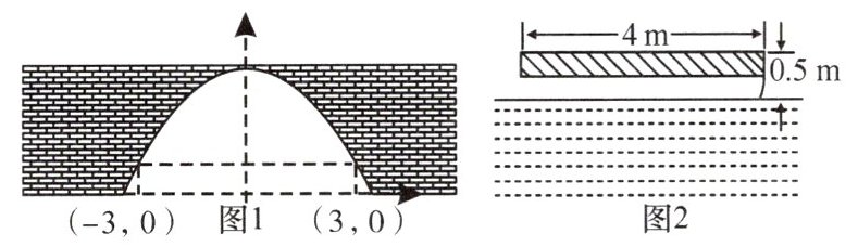 6.河上有一座桥孔为抛物线形的拱桥(如图1),水面宽6m时,水面离桥孔顶部3m,因降暴雨水面上升1m.(1)建立适当的平面直角坐标系,并求暴雨后水面的宽.(2)有一艘装满物资的小船,露出水面部分的高度为0.5m,宽4m(横断面如图2所示).暴雨后,这艘船能从这座拱桥下通过吗?(结果保留根号)
