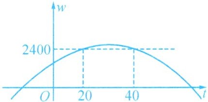 令$w=2400$,即$-\frac{1}{2}(t-30)^{2}+2450=2400$,