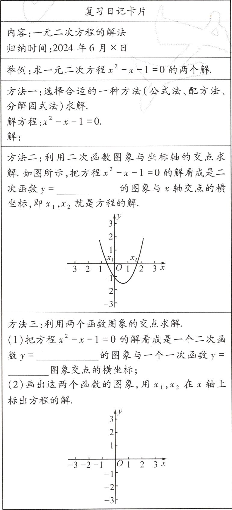 4.小明在复习数学知识时,针对“求一元二次方程的解”,整理了以下几种方法,请你按相关内容补充完整. 复习日记卡片 内容:一元二次方程的解法 归纳时间:2024年6月×日 举例:求一元二次方程$x^2-x-1=0$的两个解. 方法一:选择合适的一种方法(公式法、配方法、分解因式法)求解. 解方程:$x^2-x-1=0$. 解: 方法二:利用二次函数图象与坐标轴的交点求解.如图所示,把方程$x^2-x-1=0$的解看成是二次函数$y=$的图象与x轴交点的横坐标,即$x_1,x_2$就是方程的解. 方法三:利用两个函数图象的交点求解. (1)把方程$x^2-x-1=0$的解看成是一个二次函数$y=$的图象与一个一次函数$y=$图象交点的横坐标; (2)画出这两个函数的图象,用$x_1,x_2$在x轴上标出方程的解.