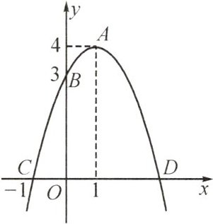 3.已知二次函数$y = ax^2 + bx + c$的图象如图所示,顶点为$A(1,4)$,抛物线与y轴交于点$B(0,3)$,与x轴交于$C(-1,0),D$两点.