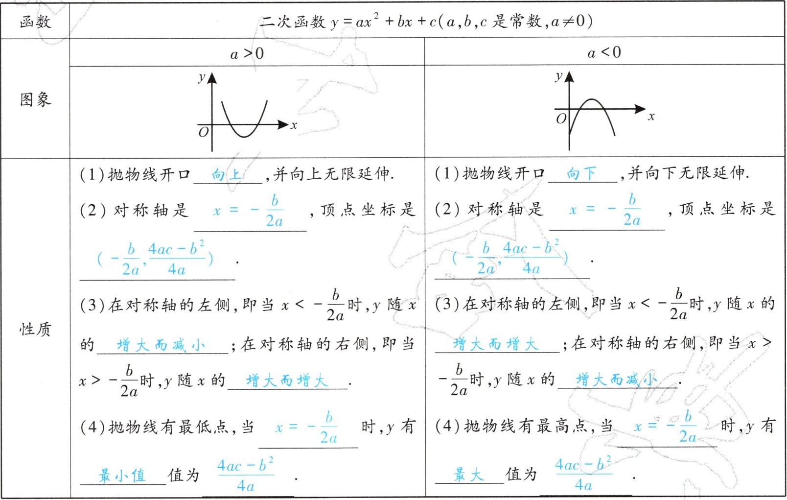 向上; 向下; $x=-\frac{b}{2a}$; $(-\frac{b}{2a},\frac{4ac-b²}{4a})$; $x=-\frac{b}{2a}$; $(-\frac{b}{2a},\frac{4ac-b²}{4a})$; 增大而减小; 增大而增大; 增大而增大; 增大而减小; $x=-\frac{b}{2a}$; 最小值; $\frac{4ac-b²}{4a}$; $x=-\frac{b}{2a}$; 最大值; $\frac{4ac-b²}{4a}$