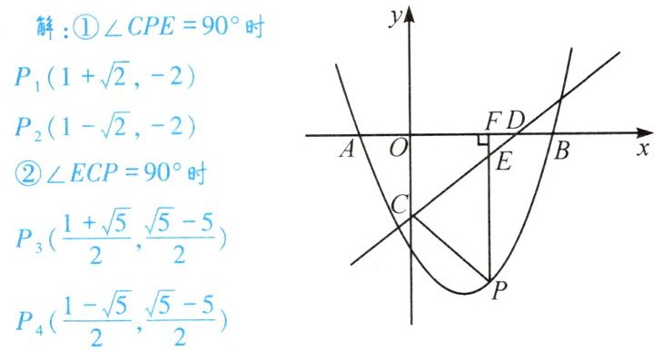 解:①∠CPE=90°时$ P₁(1+\sqrt{2},-2) P₂(1-\sqrt{2},-2) ②∠ECP=90°$时$ P₃(\frac{1+\sqrt{5}}{2},\frac{\sqrt{5}-5}{2}) P₄(\frac{1-\sqrt{5}}{2},\frac{\sqrt{5}-5}{2})$