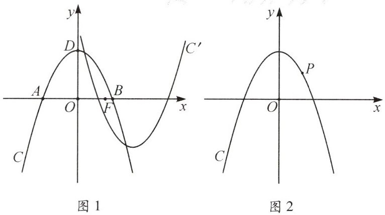 如图1,在平面直角坐标系中,抛物线C:$y=ax^{2}+bx+c$与x轴相交于A,B两点,顶点为$D(0,4)$,$AB=4\sqrt{2}$.设$F(m,0)$是x轴的正半轴上一点,将抛物线C绕点F旋转$180^{\circ}$,得到新的抛物线$C'$.