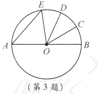 3. 如图,AB 是⊙O 的直径,$\overset{\frown}{BC}=\overset{\frown}{CD}=\overset{\frown}{DE}$,∠COD = 34°,则∠AEO 的度数是(