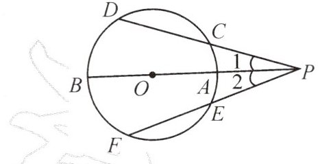 ,弦 DC,EF 的延长线交于⊙O外一点 P,直线 PAB 经过圆心 O. 请你根据现有图形,添加一个适当的条件,使∠1 = ∠2: