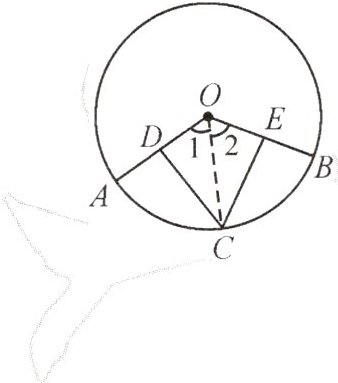 解:连接 OC. ∵$\overset{\frown}{AC}=\overset{\frown}{BC}$ ∴∠1=∠2 OD=OE OC=OC △OCD≌△OCE(SAS) ∴ CD=CE
